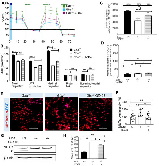 GZ452 treatment improved mitochondrial function. (A) Seahorse analysis of oxygen consumption rate (OCR) in Gba+/+, Gba-/-, and GZ452-treated Gba-/- neurons. (B) Quantitation of OCR data showed ATP production and maximal respiration was increased in GZ452-treated Gba-/- neurons (triplicate experiments, n = 4 per experiment). (C,D) Mitochondrial membrane potential (MMP) assay. GZ452 treatment significant improved MMP in Gba-/- neurons (C). CCCP treatment disrupted MMP in neurons as a negative control (D) (triplicate experiments, n = 4 per experiment). (E) MitoTracker-stained mitochondria (scale bar = 50 µM). (F) Quantitation of MitoTracker density in cells showed reduced signals in GZ452-treated Gba-/- neurons compared with untreated Gba-/- neurons (n ≥ 6 images from triplicate experiments). (G) VDAC and β-actin were measured by WB. “>” points a non-specific band. (H) Quantitation data showed GZ452 treatment reduced VDAC protein (normalized by β-actin) level in Gba-/- neurons (duplicate experiments). One-way ANOVA (* p < 0.05; ** p < 0.01; *** p < 0.001; **** p < 0.0001). ns, not statistically significant.