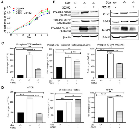 GZ452 treatment improved proliferation and reduced hyperactivity of mTOR pathway proteins in Gba-/- neuron. (A) Cell proliferation was measured by MTT assay and presents as absorbance unit at 490 nm (triplicate experiments, n = 8 per experiments). (B) Protein levels of phospho-mTOR, phospho-S6 ribosomal protein (S6-RP), phospho-4E-BP1, mTOR, S6-RP, 4E-BP1, and β-actin were measured by WB. (C) Quantitation data (normalized by β-actin) of the protein levels of phospho-mTOR, phospho-S6-RP and phospho-4E-BP1. (D) Quantitation data of the protein levels of mTOR, S6-RP, and 4E-BP1. Experiments were repeated two or three times (n = 3 samples). One-way ANOVA analysis (* p < 0.05; ** p < 0.01; *** p < 0.001; **** p < 0.0001). ns, not statistically significant.