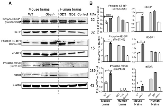 WB analysis of mTOR pathway proteins in mouse and human brains. (A) Protein was analyzed by WB. Gba-/-(NestinCre) mice brains (Gba-/-) (29 days) were compared with WT mice (35 days). Human GD2 brain (15 months) and GD3 hippocampus (11.5 years) were compared with healthy control hippocampus (12 years). (B) Fold change of WT level after normalization by β-actin. Phospho-S6-RP (arrow)/S6-RP, phospho-4E-BP1/4E-BP1, and phospho-mTOR were increased in Gba-/-(NestinCre) mice brains compared with WT mice. Student’s t-test (replicate assays, n = 2 mice brains). In human samples, phospho-S6-RP/S6-RP, phospho-4E-BP1/4E-BP1, and mTOR were increased in GD2 brain and GD3 hippocampus compared with healthy control hippocampus. Phospho-mTOR was undetectable (U.D.) in human brains (replicate experiments, n = 1 human brain). Student’s t-test (* p < 0.05; ** p < 0.01). ns, not statistically significant.