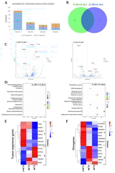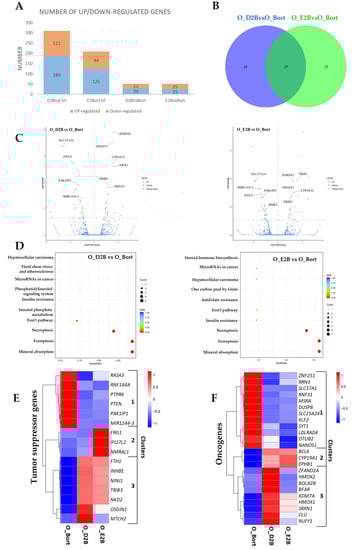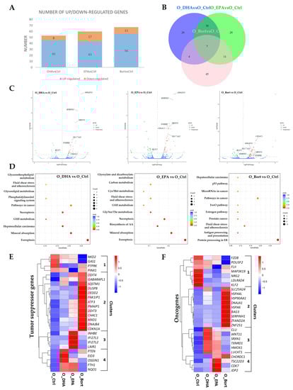 Pretreatment with DHA or EPA before bortezomib differentially regulated tumor-associated gene expression in the OPM2 cell line. Cells were pretreated with 50 µM of DHA or EPA for 0 and 2 h and treated with bortezomib (10 nM) for 4 h. Then, RNA-seq analysis was performed. (A) The number of significantly up- and down-regulated DEGs identified in different comparison groups. padj < 0.05. D2B/E2B, 2 h pretreatment with DHA/EPA plus 4 h treatment of bortezomib. (B) Venn diagrams showing the numbers of overlapping and non-overlapping DEGs in two comparison groups. (C) Volcano plots summarizing the DEGs upon treatment with D2B (left panel) or E2B (right panel). The top 10 overlapping DEGs from (B) were highlighted. Green, downregulated DEGs; red, upregulated DEGs. (D) KEGG pathway analysis of DEGs in treated cells compared to the control. The count presented the number of DEGs enriched in a particular pathway. Different colors represent padj value. Left, D2B vs Bort; right, E2B vs Bort. Hierarchical clustering heatmaps depicting the levels of differentially expressed tumor suppressor genes (E) and oncogenes (F) from RNA-Seq analysis of bortezomib, D2B and E2B-treated cells.