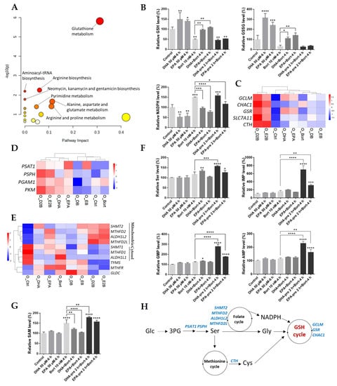 Transcriptomic and metabolomic analysis in the OPM2 cell line reveals the crucial role of GSH metabolism in increasing bortezomib chemosensitivity in MM. For metabolomic analysis, OPM2 cells were pretreated with 50 µM of DHA/EPA for 0 or 2 h, then bortezomib (10 nM) was added for 6 h treatment. (A) Metabolome pathway enrichment of 16 differentially regulated metabolites using MetaboAnalyst 5.0. The node color represents the p values, and the node size represents the pathway impact values. (B) The levels of GSH, oxidized GSH (GSSG) and NADPH upon different treatment. Heatmap analysis of the expression of the key enzymes involved in GSH metabolism (C), serine synthesis and metabolism (D) and folate cycle (E) in different conditions. (F) and (G) The levels of metabolites related to folate cycle and methionine cycle in different conditions. Data are presented as mean ± SD of three independent treatment. * p < 0.05, ** p < 0.01, *** p < 0.001, **** p < 0.0001when compared with the control. (H) Graphical representation of the metabolic enzymes and pathways associated with the GSH cycle in OPM2 cells. Enzymes were highlighted in blue.