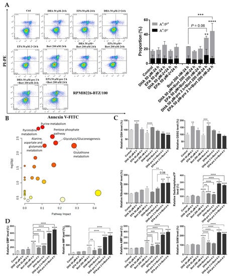 GSH metabolism plays a critical role in increasing bortezomib chemosensitivity in the bortezomib-resistant MM cell line. (A) RPMI8226-BTZ/100 was pretreated with 50 µM of DHA or EPA for 0 or 2 h and then incubated with bortezomib (200 nM) for 24 h. Apoptotic cells were determined by Annexin-V and PI staining. (B) Metabolome pathway enrichment of 24 differentially regulated metabolites using MetaboAnalyst 5.0. The node color represents the p values, and the node size represents the pathway impact values. (C) and (D) The levels of the indicated metabolites upon different treatment. Data are presented as mean ± SD of three independent treatment. * p < 0.05, ** p < 0.01, *** p < 0.001, **** p < 0.0001 when compared with the control.