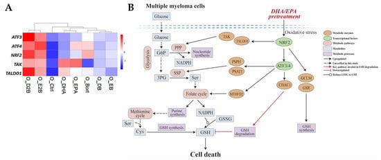 CHAC1-mediated GSH depletion may be important for bortezomib chemosensitivity in MM cells increased by DHA/EPA pretreatment. (A) Heatmap analysis of the expression of ATF3, ATF4, NRF2, TAK, and TALDO1 in different conditions. (B) Summarizing scheme. Pretreating MM cells with DHA/EPA before bortezomib induces GSH degradation through activating the NRF2-ATF3/4-CHAC1 pathway, which eventually leads to cell death. Meanwhile, metabolic pathways of PPP, SSP, folate cycle, and methionine cycle may be activated to increase GSH synthesis to recover the cellular redox homeostasis during cell death.