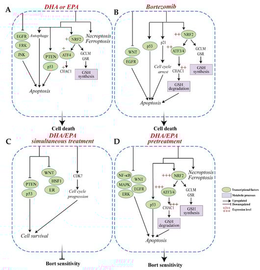 Taken together, the molecular actions relevant for bortezomib induced cell death of MM cells might include blocking pro-survival pathways of WNT/β-catenin and EGFR and activating p53-mediated cell cycle arrest and apoptosis; however, in the case of fatty acids, DHA/EPA might inhibit ERK, JNK, and EGFR signaling pathways and activate PTEN and p53 signaling pathways, autophagy, ferroptosis, and necroptosis.