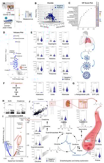 Metabolomics of hospitalized patients with (n = 543) and without (n = 288) COVID-19 (A). Partial least square-discriminant analysis of metabolomics data separated the two cohorts (B). Top 15 metabolites with the highest loading weights are indicated in the variable importance in projection (VIP) ranked list in (C). In (D), the volcano plot highlights significant effects of COVID-19 on plasma amino acid levels and purine oxidation. Violin plots (including median + ranges) are shown for amino acids (E) and purines (F) from relative quantitative analyses, and for two markers of mitochondrial dysfunction and hypoxia, alpha-ketoglutarate and sphingosine 1-phosphate (S1P), using absolute quantitative analyses against stable isotope-labeled internal standards in (G). In (H), blood urea nitrogen (BUN) and creatinine, markers of kidney dysfunction, were significantly increased in COVID-19 patients. Metabolic and clinical correlates of BUN (top positive correlate being creatinine) are in (I). A significant positive correlation (p < 0.0001; r2 = 0.871) was observed between creatinine measurements via CLIA-certified and mass spectrometry (MS)-based approaches (J). In (J), violin plots highlight metabolites in the arginine, proline, and creatine metabolism. Asterisks indicate significance (* p < 0.05; ** p < 0.01; *** p < 0.001; **** p < 0.0001).