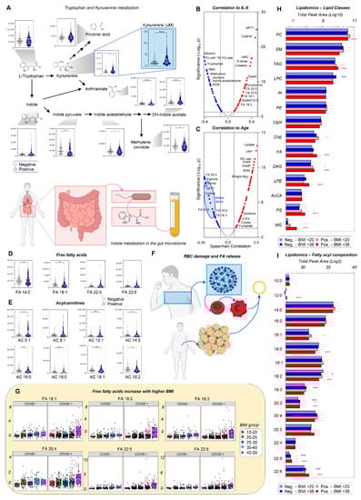 Alteration of tryptophan/kynurenine/indole metabolism as a function of inflammation, and dysregulation of lipid metabolism as a function of body mass index in hospitalized patients with and without COVID-19. In (A), violin plot of tryptophan metabolism as a function of COVID status (median + range). Metabolic and clinical correlates to interleukin 6 (IL-6) as a marker of inflammation (B) and patient age (C) indicate a strong correlation of this pathway and lipid metabolism, especially free fatty acids (D) and acylcarnitines (E), with disease state. Free fatty acids may derive from blood cell vesiculation and/or mobilization from white adipose tissue, a process that could fuel viral membrane formation (F). In (G), breakdown of free fatty acid levels as a function of patients’ body mass index (BMI) and COVID-19 status. Lipidomics analyses of COVID-19-positive and -negative patients with BMI lower than 20 or higher than 38 revealed a significant impact of these variables on lipid class (H) and fatty acyl composition (I). (p < 0.05; * p < 0.01; ** p < 0.001; *** p < 0.0001; **** p < 0.0001).