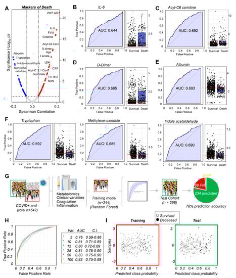 Markers of mortality in hospitalized patients, including COVID-19 patients. In (A), clinical and metabolic markers of mortality were ranked from Spearman correlation analyses (y axes indicate −log10 of p-values). Because mortality is a non-continuous variable, additional univariate (B–F) and multivariate (G) biomarker analyses were performed to calculate ROC curves and train machine learning algorithms (random forest in this figure, supporting vector machine in the Supplement) to predict mortality in hospitalized COVID-19 patients based on the top 10 clinical and metabolic variables (H), a model that yielded 78% prediction accuracy (G–I).
