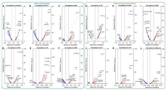 Metabolic correlates to coagulation parameters and markers of tissue and liver damage. Spearman correlation analyses correlated clinical and metabolic parameters to coagulation status (A–F) or tissue damage (G–L). Volcano plots represent metabolites that have significant (p < 0.05) positive (red) or negative (blue) correlations with any of the parameters. Parameters are abbreviated using standard clinical terms.