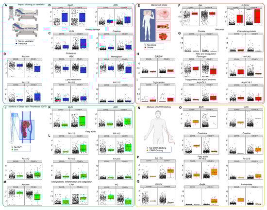 Leveraging the manually curated clinical records for the enrolled patients, we identified clinical and metabolic markers correlating with mechanical ventilation (Figure 6A–E; Supplementary Figure S11), stroke (Figure 6F–J), DVT (Figure 6K–N), and hemodialysis (with or without coagulopathy; Figure 6O–Q and Supplementary Figure S12) in both COVID-19 patients and controls. In all cases, the top markers were related to kidney dysfunction (BUN, creatinine), proteolysis/hemodilution (albumin, RBC count, hemoglobin, fibrinogen), free fatty acids (dodecanoic, linoleic, linolenic, docosapentaenoic), acylcarnitines, triglycerides, and amino acid metabolism (especially tryptophan, choline, and GABA). Trends observed in controls were more dramatic in COVID-19 patients presenting with similar manifestations.