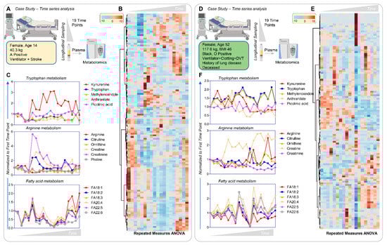 Sampling at admission allowed us to collect longitudinal samples from some patients. The results from three severe COVID-19 cases, only two of whom recovered, are presented here. Figure 8 (vectorial version in Supplementary Figures S14–S16, data in Supplementary Table S1) shows hierarchical clustering of metabolites as a function of time (19 time points for two patients and 21 for the third patient). These three patients were female, 14, 45, and 52 years old, of different ethnicity and BMI. Despite similar disease severity (e.g., all mechanically ventilated, with either stroke, clotting, or DVT manifestations), only the surviving patients manifested a spike in kynurenine levels throughout their course, which was not observed in the patient who died (Figure 8C,F). Increased creatine/creatinine eventually resolved in the surviving patients, but not in the patient who died. The surviving patients also manifested increased free fatty acid levels at the latest time points, especially poly and highly unsaturated fatty acids of the 18, 20, and 22C series; in contrast, the non-surviving patient exhibited late accumulation of acylcarnitines and amino acids which did not resolve (Supplementary Figure S16).