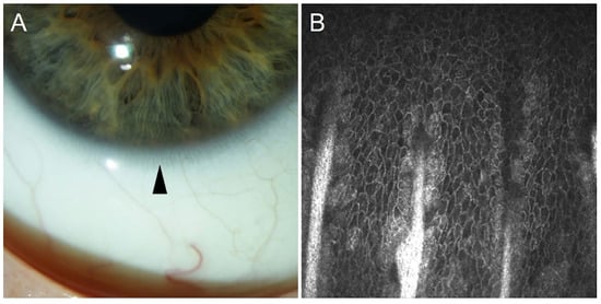 The limbal palisades of Vogt taken by slit lamp (arrowhead, (A)) and by in vivo confocal microscopy (Heidelberg Engineering GmbH, Heidelberg, (B)).