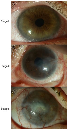 Therapeutic options of LSCD rely upon its etiology, the degree of severity and the laterality of LSCD, which have been recognized as prognostic indicators for recovery [170]. Dua et al. suggested that the prognosis of LSCD depends on the involvement of the limbus (clock-hours) and conjunctiva (percentage). Based on this hypothesis the authors proposed a new classification grading scale for the severity of ocular surface injury [170]. In 2019, the Limbal Stem Cell Working Group published a global consensus statement, which provides a classification system, diagnostic and staging criteria for LSCD staging with an international agreement [171]. According to this global consensus, there are three stages of LSCD based on the clinical presentation: stage I, stage II, stage III [171]. Figure 3 shows representative slit-lamp photographs of different stages of LSCD. Measures for patients with LSCD are very challenging because one treatment approach cannot be applied for all patients. In recent decades, much effort has been put into developing more effective measures for LSCD, including conservative medical therapy, surgical techniques, and innovative transplantation strategies [172].