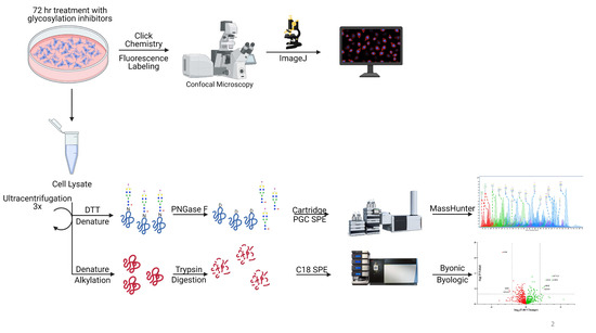 The schematic workflow for characterization of N-glycomics, proteomics, and confocal microscopy. Glycosylation inhibitors were added to the supernatant and treated for 72 h followed by cell membrane extraction and analysis. Click chemistry was performed after 72 h of treatment followed by imaging to determine 6-alkynyl fucose (6AF) incorporation. Schematic workflow was created with BioRender.com last accessed 17 August 2021.
