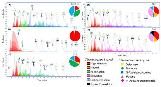 Extracted compound chromatograms of Caco-2, showing (A) control, (B) Kifunensine (Kif), (C) 2,4,7,8,9-Penta-O-acetyl-N-acetyl-3-fluoro-b-d-neuraminic acid methyl ester (3FS), (D) 2-deoxy-2-fluorofucose (2FF), and (E) 6-alkynyl fucose. Peaks are colored by glycan subtypes and annotated with the schematic representation of the glycan structures. Monosaccharide notations follow the Symbol Nomenclature for Glycans (SNFG) system [29] and N-glycans were drawn with GlycoWorkbench version 2.1 [30].