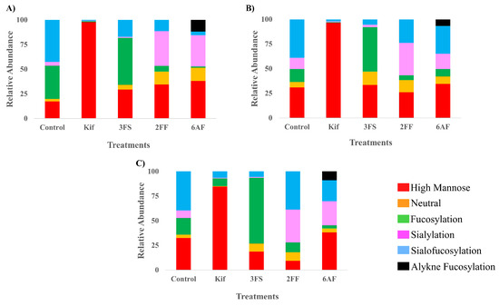 The relative abundance profile of each glycosylation inhibitor with its control counterpart plotted on stack columns with (A) Caco-2, (B) A549, and (C) PNT2 cell lines. Stack column plots are color coded by glycan subtypes.
