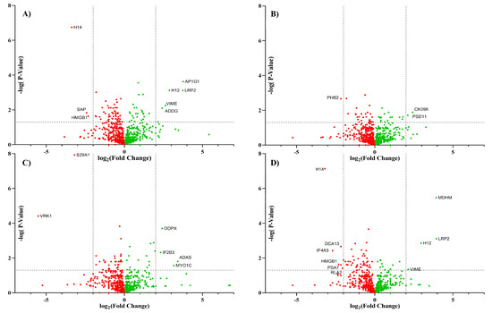 The volcano plot represents the proteomic data from Caco-2 comparing control to an inhibition treatment including (A) Kif, (B) 3FS, (C) 2FF, and (D) 6AF. Each data point represents a protein with the downregulation (red) and upregulation (green).