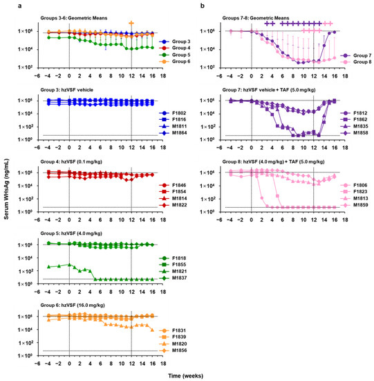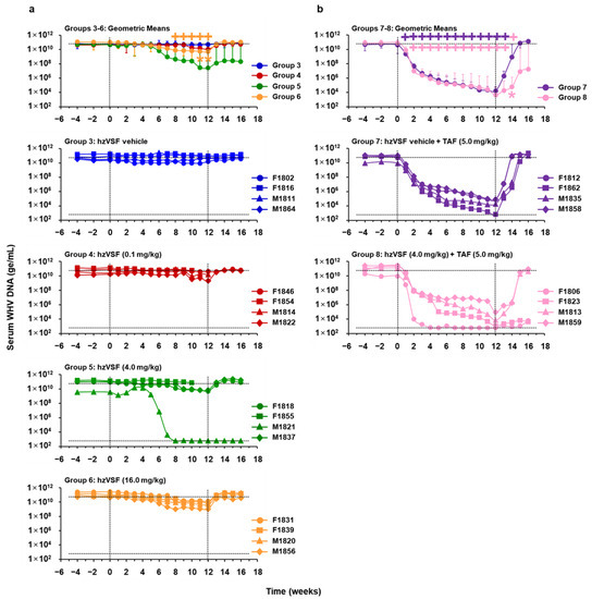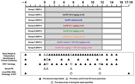 A total of three studies was performed (Figure 1): The first study included eight WHV-uninfected woodchucks and two groups. Group 1 animals (n = 4) were iv treated with hzVSF vehicle twice-weekly for 12 weeks, while Group 2 animals (n = 4) received iv hzVSF twice-weekly for 12 weeks at a dose of 16 mg/kg. The second study involved 16 chronic WHV carrier woodchucks and four groups. Group 3 animals (n = 4) were iv treated with hzVSF vehicle twice-weekly for 12 weeks. Group 4, Group 5, and Group 6 animals (each n = 4) received iv hzVSF twice-weekly for 12 weeks at doses of 0.1, 4.0, or 16.0 mg/kg, respectively. The third study involved additional eight chronic WHV carrier woodchucks and two groups. Group 7 animals (n = 4) were iv treated with hzVSF vehicle twice-weekly for 12 weeks in combination with daily po TAF for 12 weeks at a dose of 5.0 mg/kg. Group 8 animals (n = 4) received iv hzVSF twice-weekly for 12 weeks at a dose of 4.0 mg/kg in combination with daily po TAF for 12 weeks at a dose of 5.0 mg/kg. After treatment cessation, all woodchucks were followed for additional four weeks until the end of the study (EOS) at week 16 and then euthanized during weeks 17–19.