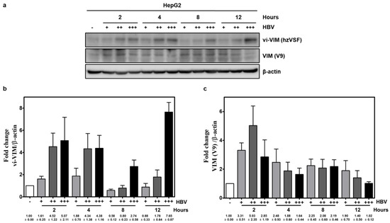 vi-VIM is induced by HBV in human hepatoma cells. (a) HepG2 cells were infected with increasing doses of precipitated HBV derived from the supernatant of HepG2.2.15 cells (i.e., + = 50 μL, ++ = 150 μL, and +++ = 300 μL of the HBV precipitate). Changes in vi-VIM level were detected with the humanized hzVSF antibody at 2, 4, 8, and 12 h pi. Parallel changes in intracellular VIM levels were assayed with the V9 antibody. Changes in protein signal were normalized to β-actin and averaged for three replicates, and are presented (b) for vi-VIM and (c) intracellular VIM as a mean ± standard error of the mean.