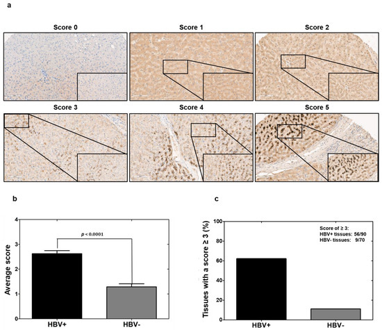 For confirming the in vitro results on HBV-induced vi-VIM upregulation, HBV-uninfected and -infected human liver tissues with progressing disease (i.e., CHB, and cirrhosis) were stained with the mVSF antibody during IHC or immunofluorescence. Staining intensity and distribution of mVSF-bound vi-VIM after IHC was scored on a 0–5 scale (Figure 4). The comparison of average scores revealed that the vi-VIM presence in HBV-infected liver was significantly increased over HBV-uninfected liver (i.e., the score nearly doubled from 1.4 to 2.7). In addition, 65.6% (56/90) of HBV-infected liver tissues were assigned with a score of ≥3, compared to the 12.9% (9/70) of HBV-uninfected liver tissues.