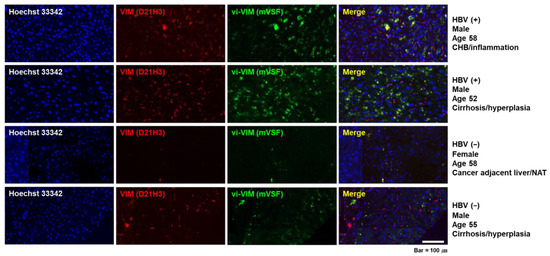 Human liver tissues were sequentially rehydrated through a graded alcohol series and then deparaffinized with xylene for 2 min. For antigen retrieval, an antigen unmasking solution (Vector Laboratories, Burlingame, CA, USA, cat. no. H-3300) was used by following the manufacturer’s protocol. Tissues were blocked with 0.4% (v/v) normal goat serum (Vector Laboratories) and 0.4% (v/v) Triton X-100 in phosphate-buffered saline (PBS) for 1 h at room temperature. Thereafter, tissues were stained with a mouse monoclonal antibody to surface VIM (mouse (m) VSF; 5 µg/mL) and with a rabbit monoclonal antibody to human endogenous VIM (D21H3; Cell Signaling Technology, Danvers, MA, USA; cat. no. 5741; 1:500 dilution) for the detection of vi-VIM or intracellular VIM, respectively. Secondary antibodies applied were Alexa Fluor 488 conjugated goat anti-mouse antibody (Jackson Immuno Research Labs, West Grove, PA, USA; cat. no. 107909; 1:1000 dilution) for mVSF, biotin-conjugated goat anti-mouse antibody (Vector Laboratories; cat. no. BA-1000-1.5; 1:1000 dilution), and Rhodamine Red X conjugated goat anti-rabbit antibody (Jackson Immuno Research Labs; cat. no. 108867; 1:1000 dilution) for D21H3. Unwanted fluorescence signal was removed using Vector TrueVIEW (Vector Laboratories) by following the manufacturer’s protocol. Counterstaining was performed with Hoechst 33,342 (Thermo Fisher Scientific; 1 µg/mL). The biotin-conjugated goat anti-mouse antibody was developed with the VectaStain ABC-HRP kit (Vector Laboratories; 1:1000 dilution) and the DAB Substrate kit (Vector Laboratories) by following the manufacture’s protocol. Counterstaining was performed with Vector Hematoxylin (Vector Laboratories). After dehydration with xylene, tissues were cover-slipped with VectaMount Mounting Medium (Vector Laboratories). Immunohistochemically stained slides were scanned with the Aperio Digital Pathology Slide Scanner AT2 (Leica Biosystems, Buffalo Grove, IL, USA). Immunofluorescence in slides was detected with the Axio Scan.Z1 slide scanner (Carl Zeiss, Oberkochen, Baden-Württemberg, Germany) and the LSM710 confocal microscope (Carl Zeiss).