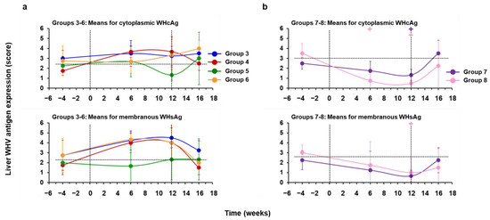 hzVSF minimally reduces WHV replication in the liver, but suppression is pronounced in combination with TAF. Comparison of means of (a) Groups 3–6 treated with placebo or hzVSF at a low, intermediate, and high dose and (b) Groups 7–8 treated with TAF, alone or in combination with hzVSF at an intermediate dose, relative to the pretreatment baseline (week −4) for intrahepatic levels of WHV DNA RI, cccDNA, and RNA. Vertical lines indicate the standard error of the mean. Horizontal dotted lines present the mean WHV nucleic acid levels of Groups 3–6 or Groups 7–8 at baseline. For the purpose of graphical presentation, hepatic WHV nucleic acids and antigens determined in terminal liver tissues after the EOS during weeks 17–19 are shown at week 16 in this and the following figure. WHV DNA RI and cccDNA in Groups 7 and 8 were significantly reduced compared to the baseline at weeks 6 and 12 or at week 12, respectively (+: p < 0.05). Compared to the baseline, WHV RNA in Group 8 was significantly reduced at week 12 (+: p < 0.05).