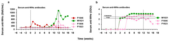 Serum WHV DNA levels were assayed quantitatively by slot-blot hybridization and real-time PCR, as described previously [54,56]. The lower limit of detection (LLOD) of the PCR assay was 600 WHV genomic equivalents (ge) or copy numbers per mL serum. Serum WHsAg levels were assayed quantitatively by an enzyme-linked immunosorbent assay (ELISA) comparable to the assay described previously [56,57]. The LLOD of the ELISA was 5 ng WHsAg per mL serum. Serum WHeAg levels were assayed qualitatively using a cross-reactive ELISA (DiaSorin, Minneapolis, MN, USA) by following the manufacturer’s protocol. Results were obtained as an optical density read out, and a value of ≤0.055–0.057 optical density units (ODU) indicated absence of WHeAg in this study. Serum anti-WHs antibody titers were assayed quantitatively using an established enzyme immunoassay (EIA), as described previously [56,57]. The LLOD of the EIA using a 1:100 sample dilution was 100 standard units (StdU) per mL serum. Serum anti-WHe antibody levels were assayed qualitatively using a cross-reactive ELISA (DiaSorin) by following the manufacturer’s protocol. An ODU value of ≥2.19 or ≥2.52 (i.e., sample ODU value at pretreatment (T0) minus sample ODU value in a given study week) indicated presence of anti-WHe antibodies in this study.