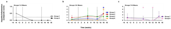 Treatment with hzVSF at the high dose or with TAF, alone and together with hzVSF at an intermediate dose, reduces inflammation in the liver. Comparison of mean composite scores of portal and sinusoidal hepatitis of (a) Groups 1–2 treated with placebo or hzVSF at a high dose, (b) Groups 3–6 treated with placebo or hzVSF at a low, intermediate, and high dose, and (c) Groups 7–8 treated with TAF, alone or in combination with hzVSF at an intermediate dose, relative to the pretreatment baseline (week −4). Vertical lines indicate the standard error of the mean. Horizontal dotted lines present the mean composite score of Groups 1–2, Groups 3–6, or Groups 7–8 at baseline. The composite score in Group 8 was significantly reduced compared to the baseline at weeks 6 and 12 (+: p < 0.05). Compared to the baseline, the composite score in Group 3 and Group 6 was significantly increased after the EOS (+: p < 0.05). The composite score was derived from the sinusoidal hepatitis score plus the portal hepatitis score. Composite score: 0 = absent, >0–2 = mild, >2–4 = moderate, and >4 = marked to severe hepatitis/liver inflammation.