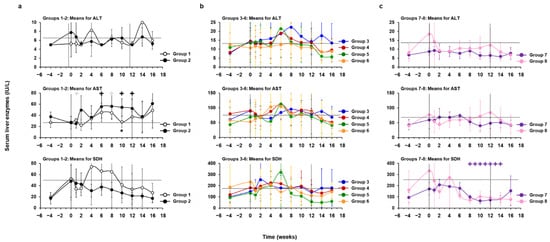 Correlating further with the reduced liver inflammation during treatment, the mean serum levels of the liver enzymes ALT, AST, and SDH were not significantly elevated from the pretreatment baseline in most groups during the study (Figure 14 and Figures S11–S13). The only exception was a significantly higher AST level in WHV-uninfected woodchucks of Group 2 during hzVSF treatment at week 10, when compared to placebo-treated animals of Group 1. Individual WHV-uninfected and -infected woodchucks across the experimental groups sometimes presented with pronounced elevations in liver enzymes; however, these increases were sporadically observed at pretreatment, during treatment, and/or during the follow-up. Most often, the same animals within a group had elevations in two or all three liver enzymes around the same time, and changes in ALT and AST levels were not limited to animals with suppressed or absent WHV replication after the EOS. SDH elevations were typically present in woodchucks with more pronounced declines in serum viremia and/or antigenemia during treatment with hzVSF, alone and together with TAF, such as animals M1822 (Group 4), M1821 and F1855 (Group 5), M1856 (Group 6), and F1806 and F1823 (Group 8), suggesting an effect mediated by the monoclonal antibody. This was opposite to TAF monotreatment in Group 7 animals, with no pronounced changes in SDH levels, suggesting absent or only minor effects by the NA. Nevertheless, liver enzyme increases in individual woodchucks reversed, and AST levels in Group 7 normalized during treatment, as also noted for SDH in Group 8.