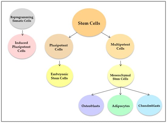 In cell therapy strategies, stem cells (SCs) have been used successfully for presenting characteristics that are essential to promote tissue regeneration, such as self-renewal capacity and potential for differentiation in specialized cell lines. Several SCs lineages have distinct differentiation potentials (Figure 1). Embryonic stem cells (ESCs) are pluripotent and have the ability to differentiate into most specialized cells in the organism. However, ethical issues limit the use of ESCs in clinical practice. To address this question, recent strategies have investigated the regenerative potential of induced pluripotent stem cells (iPSCs), obtained by reprogramming somatic cells through the regulation of transcription factors. However, the genetic manipulation of the cell may represent a limitation, so that researches have advanced in order to expand the use of this strategy. Other SCs lines are multipotent, such as mesenchymal stem cells (MSCs) [7,8]. MSCs are undifferentiated stromal cells present in most adult connective tissues and can be obtained from several sources, such as bone marrow, periosteum, adipose tissue, skin, muscle, tendons, umbilical cord, peripheral circulation and dental tissue [5,9,10]. MSCs are capable of self-renewal, proliferation and differentiation in some specialized cell lines, such as osteoblasts, chondroblasts and adipocytes (Figure 2) [5,7,8]. In addition, MSCs presents adherent growth on culture plastic and can be characterized by the expression of specific surface antigens, such as CD90, CD73, CD29 and CD105 [1,5,7,8].