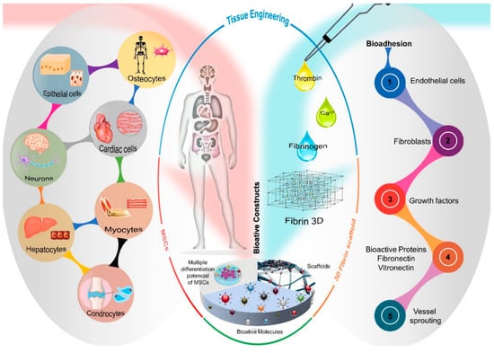 Fibrin glue is biocompatible, non-cytotoxic and naturally biodegraded by the action of fibrinolytic enzymes [13,19,20,21]. Since it consists basically of fibrinogen and factor XIII (component I), thrombin and calcium chloride (component II), fibrin glue can be obtained from plasma components, enabling the construction of autologous scaffolds, which reduces the risk of infection and immunological reaction [11,17,22]. The fibrin glue also allows for a uniform distribution of cells in the scaffold and the implantation of this scaffold can be carried out by a less invasive technique that allows the filling of the lesion area [14,19]. In addition, fibrin glue constitutes a bioactive matrix that favors cell viability, adhesion, proliferation and differentiation [13,14,23]. The fibrin matrix contains binding sites with several cells and biomolecules that act in the tissue regeneration process, such as endothelial cells, fibroblasts, growth factors and several proteins in the extracellular matrix, such as fibronectin and vitronectin that regulate cell adhesion, migration and proliferation (Figure 2) [14,19]. Additionally, the fibrin matrix presents a porous structure that favors cell migration, vascular infiltration and the angiogenesis process, which are indispensable for tissue repair [13,14,23,24].