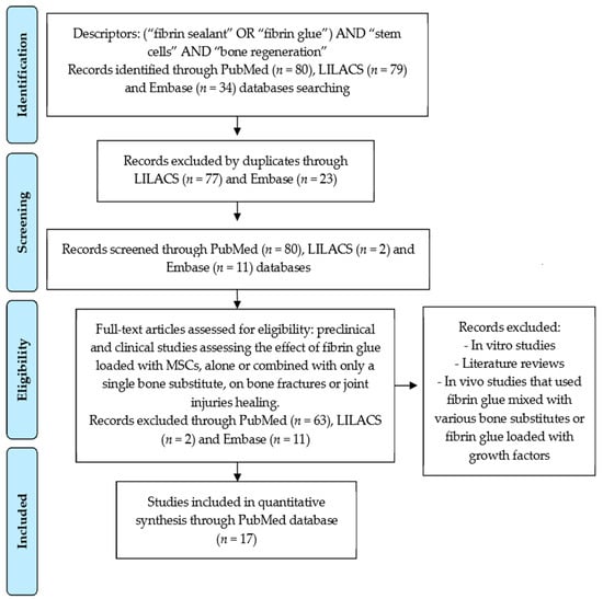 This systematic review was carried out in April-May 2021 and was conducted in accordance with the PRISMA guidelines and the PICO strategy (Patient, Intervention, Comparison and Outcomes). The study design was structured in the selection of clinical trials and preclinical studies that used animal models to evaluate the regenerative potential of fibrin glue loaded with MSCs in the healing of fractures, bone defects and cartilage injuries. The electronic bibliographic search was carried out in the PubMed/MEDLINE, Embase and LILACS databases, combining the descriptors (“fibrin sealant” OR “fibrin glue”) AND “stem cells” AND “bone regeneration”. All studies published until the year 2021 were considered. The results of the bibliographic search are described in the Prisma Flow Diagram (Figure 3).