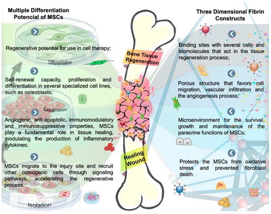 Schematic illustration of the tissue engineering process steps shows the properties of MSCs and fibrin scaffolds, suggesting a synergistic effect on bone formation resulting from a specialized tissue construction for wound healing, see in the center of the figure in a bone defect. Bone fracture healing steps: a spatiotemporal cascade of growth factors regulates bone regeneration during fracture repair. In the initial phases of this process, there is the formation of a blood hematoma incorporating fibrin scaffold with MSCs, attracting cell migration, bioadhesiveness of active molecules and proteins intrinsically related to the bone regeneration process, constituting a favorable microenvironment for osteoid matrix deposition.