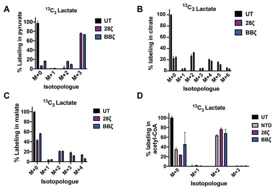 Lactate supports TCA cycle anaplerosis and short chain CoA synthesis in CAR T-cells. Activated CAR T-cells (day 7) were refed with RPMI medium, conditioned with 10% dialyzed FBS, and supplemented with 20 mM 13C3 lactate for 1 h. Mass isotopomer data for pyruvate (A) and citrate (B) are shown. Mean values ± S.E.M. from 3 technical replicates are shown. UT: untreated; 28ζ: T-cells lentivirally infected with a 28ζ CAR and treated with 13C3 lactate; BBζ: T-cells lentivirally infected with a 4-1BBζ CAR and treated with 13C3 lactate. (C,D) Activated T-cells (day 10) were refed with RPMI medium, conditioned with 10% dialyzed FBS, and supplemented with 20 mM 13C3 lactate overnight. Mass isotopomer data for malate and acetyl-CoA are shown. Mean values ± S.E.M. from 3 technical replicates are shown. NTD: nontransduced T-cells; 28ζ: T cells lentivirally infected with a 28ζ CAR and treated with 13C3 lactate; 28ζ NOX: T-cells lentivirally co-infected with a 28ζ CAR, as well as Lactobacillus brevis NADH Oxidase (LbNOX) and treated with 13C3 lactate BBζ: T-cells lentivirally infected with a 4-1BBζ CAR and treated with 13C3 lactate.