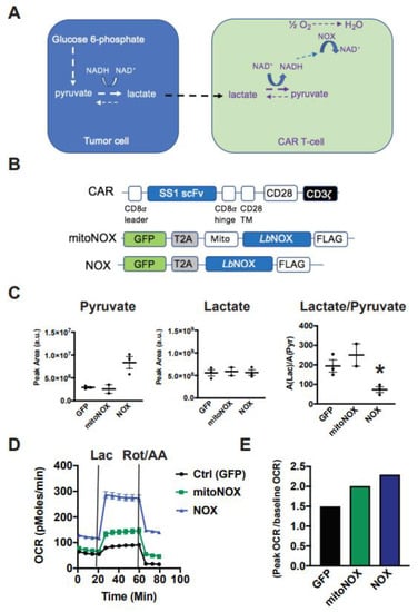 For these reasons, we devised an approach to “arm” T-cells with an enzyme that restores redox balance whilst simultaneously catalyzing the conversion of lactate to pyruvate. Lactobacillus brevis NADH oxidase (LbNOX) fulfills this dual role. The bacterial enzyme LbNOX was effectively repurposed as a genetic tool to regulate redox status in HeLa cells [10]. A mitochondrial form of LbNOX normalized NADH/NAD+ ratios, decreased reductive stress, and rescued proliferative defects in fibroblasts treated with an inhibitor to complex 1 of the ETC [11]. A more recent study provided evidence that LbNOX restored redox balance in chronically stimulated mouse T-cells [8]. Collectively, these data support our hypothesis that heterologous LbNOX expression will restore functional competence to CAR T-cells traversing lactate-rich, hypoxic tumor environments.