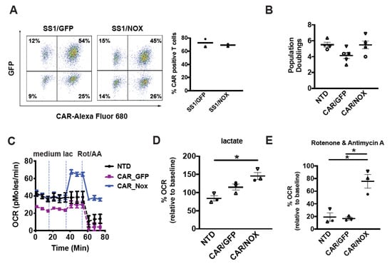 Lactobacillus brevis NADH Oxidase (LbNOX)-expressing CAR T-cells maintain high rates of oxygen consumption despite electron transport chain (ETC) inhibition. (A) After overnight stimulation with Dynabeads, T-cells were co-infected with a mesothelin-specific (SS1-28z) CAR and LbNOX lentiviral supernatants. These cells were expanded for 7 days. Surface SS1 CAR expression was measured by staining with a biotinylated goat anti-mouse IgG (H + L) followed by streptavidin (SA)-Alexa Fluor 680 labeling. LbNOX levels were simultaneously detected by GFP expression. CAR+ cells were defined as double positive for LbNOX (Y-axis) and APC (X-axis). Representative flow plots and mean frequencies ± SEM from two independent experiments with separate donors are shown (left and right panels, respectively). (B) After overnight stimulation with Dynabeads, activated T-cells were co-infected with a mesothelin-specific (28z) CAR and LbNOX lentiviral supernatants. Cell enumeration was performed every other day beginning on day 3 until the number of cells in the culture ceased increasing, and the mean cell volume was below 350 fL (day 10). The maximum number of population doublings is plotted with the horizontal bars representing the mean and each symbol representing a separate donor. (C) GFP vs. LbNOX-expressing CAR T-cells were expanded for 4 days and then transferred to bicarbonate free XF assay medium containing 10 mM glucose and 2 mM glutamine. Metabolic parameters were measured with a Seahorse assay. Cellular oxygen consumption rates (OCR) were measured at baseline, and following the serial addition of XF assay medium, 20 mM lactate and 500 nM rotenone/antimycin A. Representative data from 3 independent experiments with separate donors are shown. Values are means ± S.E.M from 6–8 replicates per assay. (D) OCR levels following lactate treatment are expressed as a percentage of baseline OCR. These are plotted with the horizontal bars representing the mean and each symbol representing a separate donor (n = 3). * p < 0.05 for CAR/NOX vs. NTD. (E) OCR levels following rotenone and antimycin A treatment are expressed as a percentage of baseline OCR (n = 3). * p < 0.05 for CAR/NOX versus NTD; * p < 0.05 for CAR/NOX vs. CAR/GFP. All data were analyzed by a one-way ANOVA using a Holm–Sidak multiple comparison post hoc test.