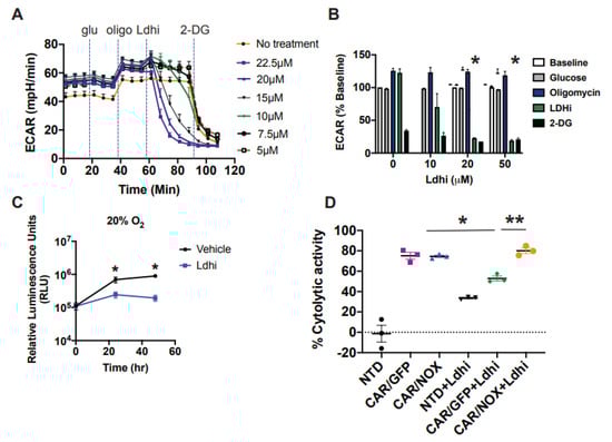 Lactobacillus brevis NADH Oxidase (LbNOX) rescues CAR T-cell cytotoxicity in cultures treated following Lactate Dehydrogenase (LDH) inhibition. (A,B) The metabolic properties of EM-meso cells were measured by a Seahorse assay. Extracellular acidification rates (ECAR) following the serial addition of 20 mM glucose, 1.5 uM oligomycin, Ldhi, and 20 mM 2-DG are shown in a representative Seahorse plot (left panel). Inhibiting LDH (Ldhi) reduces EM-meso cell glycolytic activity in a dose-dependent manner. Mean ± SEM values from multiple independent experiments with separate donors (n = 2–3) are shown (right panel). Ldhi ECAR values were measured 33 min following Ldhi injection and 20 μM Ldhi significantly reduced glycolytic activity relative to vehicle control (* p < 0.05). Statistical comparisons were compared using an unpaired Student’s t test. (C) EM-meso-CBG cells were seeded in triplicate in 96-well plates and treated with either the vehicle or 20 μM Ldhi. Their growth was measured by a luminescent assay. The mean ± S.E.M. values of 3 independent experiments are shown. * p < 0.05 for Ldhi vs. the vehicle at 24 h and 48 h. (D) The specific cytotoxicity of anti-mesothelin CAR T-cells was measured by luciferase-based killing assay. CAR T-cells were co-cultured with EM-meso cells at a 3:1 effector: target cell ratio for 22 h in medium conditioned with 20 μM Ldhi. The mean ± S.E.M. values of 3 independent experiments with separate donors are shown. * p < 0.05 for CAR/GFP vs. CAR/GFP+Ldhi; ** p < 0.05 for CAR/GFP+Ldhi vs. CAR/NOX+Ldhi. Data were analyzed by a two-way ANOVA using a Newman–Keuls multiple comparison post hoc test.