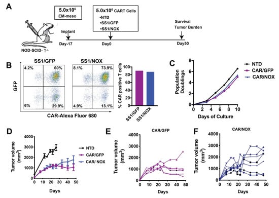 Investigating the antitumor function of Lactobacillus brevis NADH Oxidase (LbNOX)-expressing CAR T-cells. (A) Experimental layout including a schematic of the EM-meso xenograft model. (B) A total of 5 × 106 EM-meso cells were injected subcutaneously into adult NSG mice. (C) Activated T-cells were co-infected with a mesothelin-specific (28ζ) CAR and LbNOX lentiviral supernatants, then expanded over 9 days. (D) Surface SS1 CAR expression was measured by staining with a biotinylated goat anti-mouse IgG (H+L) followed by streptavidin (SA) Alexa Fluor 680 labeling. LbNOX levels were simultaneously detected by GFP expression. CAR+ cells were defined as double positive for LbNOX (Y-axis) and Alexa Fluor 680 (X-axis). (E) Expansion curves showing the number of population doublings per cell over 10 days. Cell enumeration was performed every other day beginning on day 3 until the number of cells in the culture ceased increasing and the mean cell volume was below 350 fL. (F) A total of 5 × 106 CAR+ T-cells were I.V. injected 17 days after tumor implantation (NTD: n = 4; CAR/GFP: n = 6; CAR/NOX: n = 7). Tumor volumes were measured by caliper at the indicated time-points as described in the Materials and Methods section. Values represent mean ± S.E.M. for each group. Tumor size (NTD vs. CAR/GFP vs. CAR/NOX) was compared by two-way ANOVA using a Holm–Sidak multiple comparison post hoc test. Tumor size was significantly less (p < 0.05) in all CAR expressing groups relative to the NTD control (analyzed at day 26, a threshold time-point when NTD were sacrificed). No statistical differences were observed across CAR treatment groups at the nadir of tumor development (day 40) or during the terminal phase of the study.