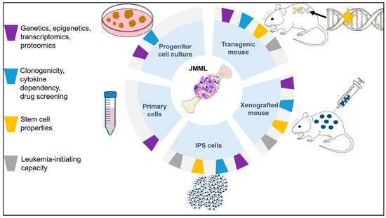 Maintaining patient-derived primary cells in a dish is appealing to every researcher. Starting as early as 1974, cells derived from bone marrow (BM) and peripheral blood (PB) of patients diagnosed with JMML were cultured in semisolid media. The experiments uncovered a characteristic capacity of JMML progenitor cells for excessive formation of monocyte-macrophage colonies in vitro [23]. This feature was repeatedly observed in the context of different studies [24,25,26,27]. Cultures in semisolid media were also instrumental in elucidating the hypersensitive response of JMML progenitor cells to several hematopoietic cytokines, specifically the granulocyte-macrophage colony-stimulating factor (GM-CSF) [28,29], tumor necrosis factor α [30], and interleukin-1 [31]. Other studies were geared toward inhibiting the proliferation and the colony formation of JMML cells, with the ultimate goal to find a potential therapy for the disease [32,33,34,35]. For example, the inhibition of the above factors by interleukin-10 resulted in decreased colony formation and cell viability [36].