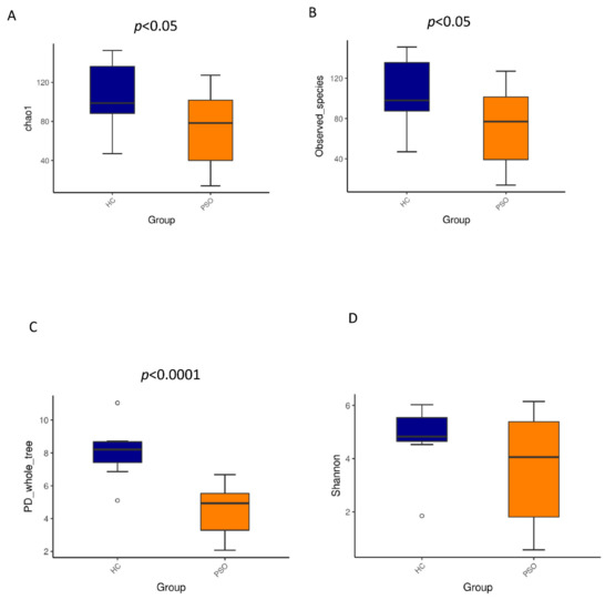 Alpha diversity metrics of plasma bacterial communities between healthy and psoriasis patients. Boxplots for comparison of species richness (chao1 index (A), observed species (B)) between the two study groups, (C) boxplots for comparison of phylogenetic diversity (PD whole tree), (D) boxplots for comparison of species diversity (Shannon index) (HC: healthy control group; PSO: psoriasis group).