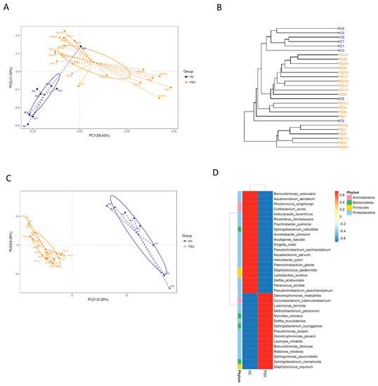 The β-diversity in distinct microbiota of healthy individuals and psoriasis patients. β-diversity changes in plasma microbiota across groups by the principal coordinate analysis (PCoA)(A), UPGMA cluster analysis (B), and partial least squares discriminant analysis (PLS–DA) (C). Each node represents each sample, and the control and PSO subjects are colored in blue and orange, respectively. Heat map of the top 35 genera among groups (D) (HC: healthy control group; PSO: psoriasis group).