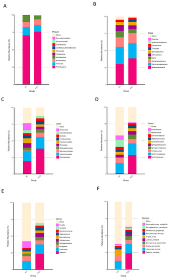 Relative abundance distribution of the top 10 species in phylum (A), class (B), order (C), family (D), genus (E), and species (F) in the two groups (HC: healthy control group; PSO: psoriasis group).