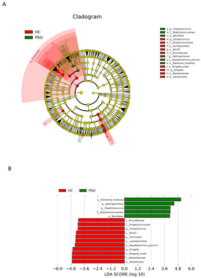 LEfSe with a logarithmic LDA score cutoff >4.0 was used to compare the estimated phylotypes of microbiota from the PSO and HC groups. The microbial communities in the PSO group were significantly more diverse (Figure 5A). A histogram of the LDA scores indicated that the phylum Firmicutes, class Bacilli, order Lactobacillales, family Brucellaceae, genus Streptococcus, and species K. oralis, as well as A. parvum, were more abundant in the HC group, whereas in the PSO group, the order Bacillales, family Staphylococcaceae, genera Staphylococcus and Sphihgomonas, and species R. insidiosa were of greater abundance (Figure 5B).