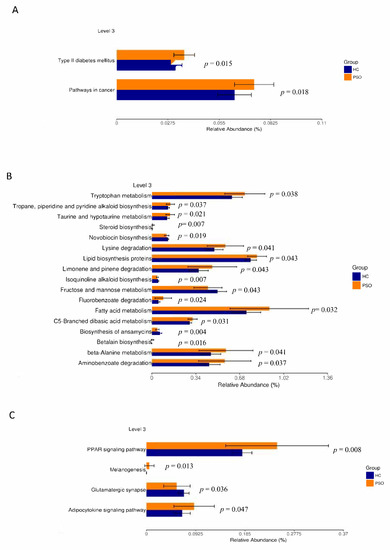 The prediction of genetic potential was analyzed by performing PICRUSt analysis based on 16S rRNA metagenome sequences. PICRUSt predicted metagenome content to Level 3 of the Kyoto Encyclopedia of Genes and Genomes database (KEGG) orthology and identified 268 functional pathways belonging to different Level 1 KOs. A total of 23 functional pathways were identified that belong to human diseases, metabolism, and organismal systems (Figure 6). Type 2 diabetes mellitus and pathways associated with cancer were enriched in the PSO group (Figure 6A). A variety of metabolic pathways, such as those of tryptophan metabolism, lipid biosynthesis proteins, and fatty acid metabolism, were significantly enhanced in the PSO group, while fructose and mannose metabolism and biosynthesis of ansamycins were increased in the HC group (Figure 6B). The PPAR, melanogenesis, and adipocytokine signaling pathways were significantly enhanced in the PSO group (Figure 6C). Collectively, our data suggest that a change in bacterial composition can lead to significant changes in gene functions, which correlates with inflammatory status in psoriasis.