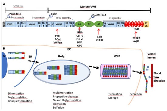 VWF monomers are dimerized in the ER through disulfide bonds between the CK domains in a “tail-to-tail” manner. Protein disulfide isomerase (PDI) isoform A1 catalyzes the formation of two intermolecular bonds between Cys2771 and Cys2773 which facilitates a third bond between residues Cys2811 of the two monomers [7]. The dimers arrange into “bouquet-like” structures, in which the C-terminal domains of the two VWF monomers are closely associated with each other into a stem region [8]. Dimers are translocated to the Golgi apparatus where multimerization is catalyzed by VWF’s pro-peptide itself as its oxidoreductase activity is switched on by the lower pH in the Golgi [9]. Thereby, dimers are connected by disulfide linkage between the D’D3 domains in a “head-to-head” manner [10]. Meanwhile, the pro-peptide consisting of the D1-D2 assemblies is cleaved off by furin but stays non-covalently attached to the mature VWF [11]. During maturation, VWF is further decorated by extensive N- and O-glycosylation, sialylation [12,13,14,15] and sulfation [16] (Figure 1B). The newly synthesized VWF is either secreted basolaterally by ECs as low-molecular weight (LMW) VWF or packaged into specific storage organelles, called Weibel–Palade bodies (WPBs) [17]. From WPBs, secretion of ultra-large VWF (UL-VWF) predominantly occurs apically via basal as well as regulated secretory pathways. Basally secreted VWF is released continuously from WPBs in the absence of stimuli to maintain a constant plasma antigen level of VWF [17]. Stimulated secretion, for example, by histamine [18], thrombin [19], epinephrine [20] or vasopressin [21] facilitates VWF to fulfill its role in platelet recruitment to the vessel wall [17]. In contrast to storage in ECs, VWF in megakaryocytes and platelets is stored in α-granules [22].