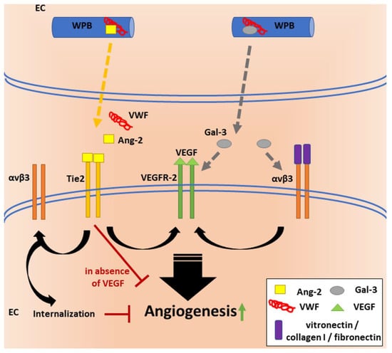 Another ligand which can activate the proangiogenic effects of VEGFR, by activation of αvβ3, is the glycan-binding protein galectin-3 (Gal-3) [68]. Similar to Ang-2, Gal-3 also happens to be a WPB-localized molecule that was shown to directly bind to VWF intra- as well as extracellularly [69]. Therefore, Gal-3 might also be involved in VWF-regulated angiogenic processes.