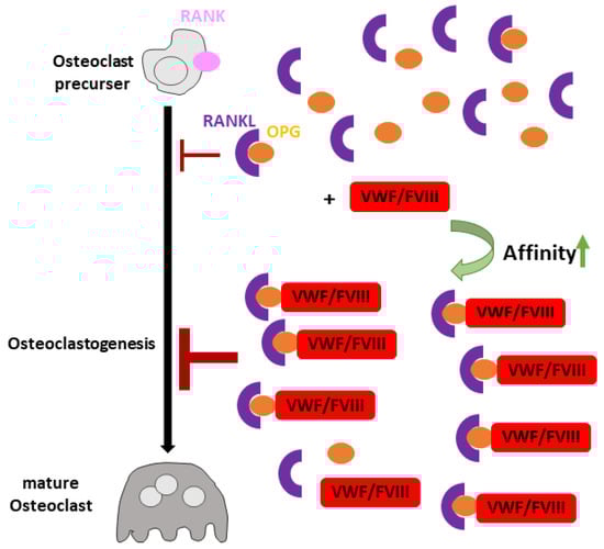 To fulfill its role as an inhibitor of osteoclastogenesis [152,153], OPG acts as a decoy receptor for Receptor Activator of Nuclear factor κB Ligand (RANKL). This interaction prevents the binding of RANKL to its receptor RANK, which induces osteoclastic differentiation and maturation, leading to bone resorption [154,155]. Baud’huin et al. investigated the contribution of VWF in these processes and found only the VWF–FVIII complex to increase the inhibitory effect of OPG on RANKL-induced osteoclastogenesis by an additional 18%. FVIII alone had no effect. Surface plasmon resonance measurements showed that the VWF–FVIII complex interaction with OPG increased the binding affinity of OPG to RANKL, thereby enhancing the inhibitory effect of RANKL on osteoclastic differentiation [156] (Figure 3).