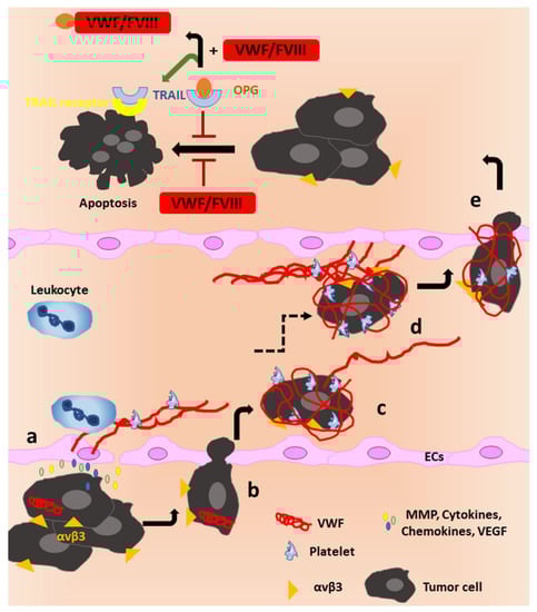 VWF’s role in tumor cell apoptosis and metastasis.Upper part: In the absence of the VWF–FVIII complex (red), OPG (orange) binds to Tumor necrosis factor-Related Apoptosis-Inducing Ligand (TRAIL, blue), leading to inhibition of tumor cell apoptosis. The presence of the VWF–FVIII complex functions as a decoy receptor for OPG, and TRAIL is released to interact with its receptor, inducing apoptosis of the tumor cell. If only VWF is present, it has anti-apoptotic properties, promoting tumor cell survival. Lower part: a: Tumor cells release a variety of proteins (matrix metalloproteinases (MMPs), vascular endothelial growth factor (VEGF), cytokines and chemokines) to induce disintegration of the subendothelial extracellular matrix and to activate the endothelium. ECs then release ultra-large (UL-)VWF, increasing the VWF antigen and promoting the formation of platelet-decorated strings as well as recruitment of leukocytes. b: The resulting proinflammatory cytokine signaling, enhanced angiogenesis, and altered vascular permeability create a premetastatic environment, promoting tumor growth and the transmigration of tumor cells through the endothelium into the blood stream. c: The metastatic cells can bind VWF via integrin αvβ3 and shield themselves from detection by immune cells by cloaking themselves in a shell of VWF and platelets. Some tumor cells acquire the ability to produce VWF to further potentiate these effects. d: Interaction of tumor cells with VWF and platelets may further support adhesion to the vessel wall, helping the cells to initiate. e: extravasation to the metastatic site.