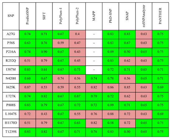 The expected accuracy results of the SNPs of DROSHA predicted as deleterious (marked in red) or benign (highlighted in green) in the PredictSNP server and integrated tools.