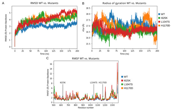 Results of 200 ns MD simulations of DROSHA wild-type protein along with its mutants (I625K, L1047S, H1170D). (A) RMSD trajectories of a protein’s backbone relative to the initial frame, (B) radius of gyration values, and (C) RMSF values of protein’s backbone.