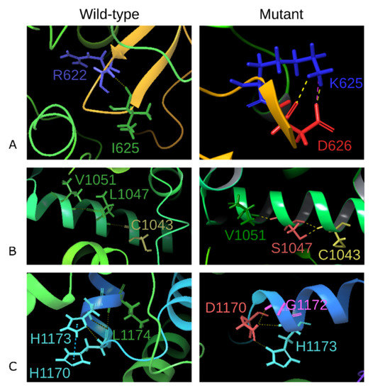 The interactions and the corresponding bonds that were formed by the mutated residues were compared with the native DROSHA protein model. The 625th isoleucine residue forms a hydrogen bond with Arg622, fixing the β-sheet turn (Figure 3A), whereas the I625K mutant loses the foregoing H-bond and contacts with Asp626 through two H-bonds along with a newly formed salt-bridge, that indicates the loss of β-sheet stabilization and the formation of a very strong additional ionic interaction of the short bond between neighbor amino acids [55]. The 1047th leucine residue forms a single H-bond with Cys1043 and Val1051 within the α-helix, while the mutated Ser1047 creates an additional H-bond with Cys1043, which may indicate a less flexible helix formation (Figure 3B). Histidine at position 1170 interacts with histidine 1173 through the pi-pi stacking along with another H-bond, as well as contacts with L1174 via an H-bond. The pi-pi stacking is formed between H1170 at the α-helix and H1173 at the loop region, having the preferred interaction geometry of parallel–displaced arrangement—such fact suggests the stabilization of these elements relative to each other. Mutation H1170D leads to the loss of the pi-pi stacking interaction with H1173—only two H-bonds have remained with this residue. Additionally, a newly formed H-bond between D1170 and G1172 has occurred (Figure 3C).